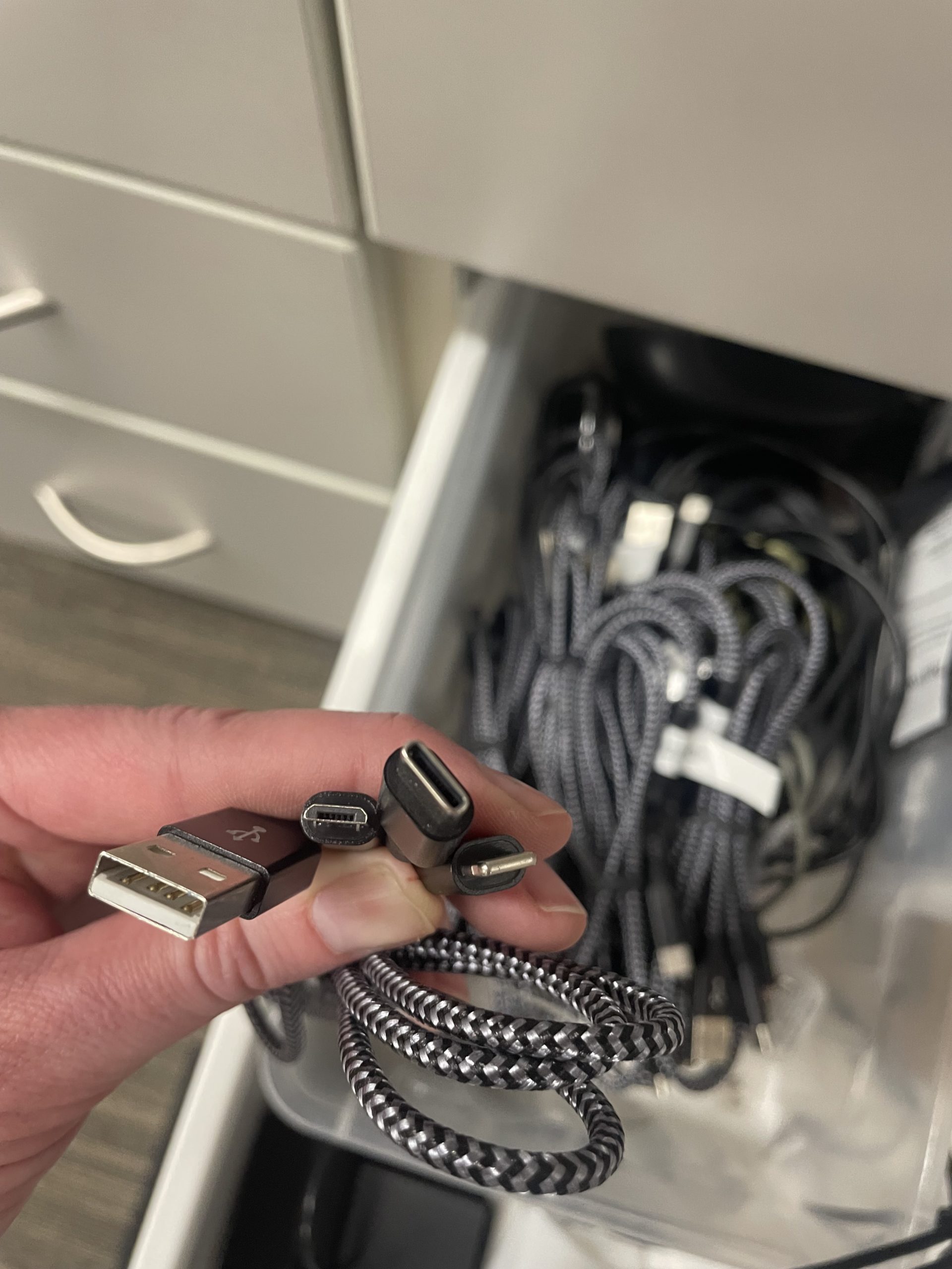 - Grab a cord and connect it to the charging bank before giving it to the patron. The cords are black and white braided cords and have connectors for Apple and Android phones. The cords are in the drawer to the right of the Ref computer labeled “Charging Cords and Headphone Adaptors.”