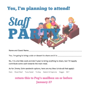 On or after January 19, Lori and I will be deep cleaning the Staff Kitchen. We’re going to remove everything from the refrigerator, freezer, and cupboards and clean all the shelves and make decisions on what comes out of/off of those shelves. We also may tackle re-organizing the wall of paper.